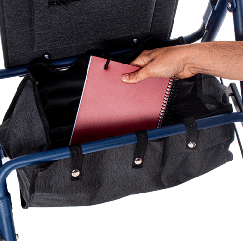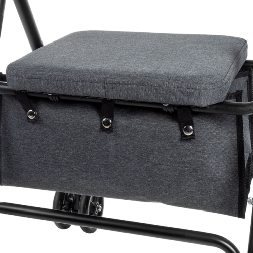 El andador está equipado con una cesta de tela opaca de 18 litros de capacidad, ideal para almacenar objetos con un peso de hasta 8 kg. El asiento abatible permite un acceso fácil a la cesta, que además se puede extraer con comodidad para facilitar su lavado rápido.