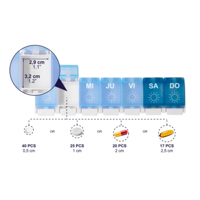 Identificar cada día es muy fácil ya que, además de una letra grande y clara fácilmente legible, las iniciales de los días están escritos en español, para que no haya ningún problema a la hora de tomar comprimidos.