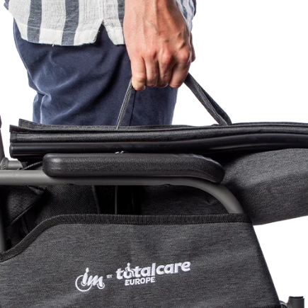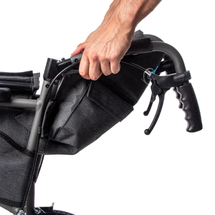 El asiento de la Saby Lite incorpora dos cintas de tejido que facilitan el transporte de la silla cuando está plegada.