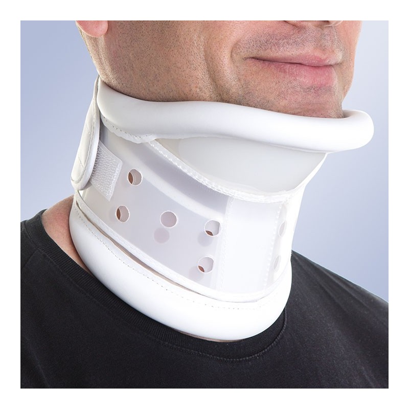 Fabricado en dos piezas de polietileno superpuestas, regulable en altura mediante el velcro de unión, la valva superior se encuentra diseñada para alojar el mentón distribuyendo la presión en toda su superficie, aportando mayor confort. Se encuentra almohadillado en sus bordes superior e inferior y forrado de polipiel con sistema de cierre posterior mediante velcro.
